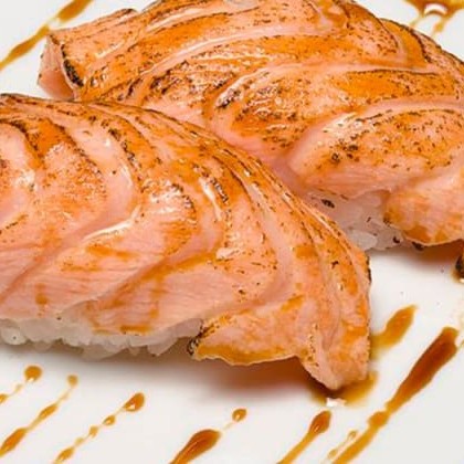 Saboreie nosso 'Sushi de Salmão Maçaricado - 4 Unidades'. Esse é um prato de categoria 'Sushi', meticulosamente preparado com arroz delicadamente temperado, perfeitamente equilibrado para realçar o sabor. Cada peça é coberta por uma generosa fatia de salmão de altíssima qualidade, cuidadosamente selecionada. O salmão é então maçaricado à perfeição, criando uma textura única que derrete na boca, proporcionando uma experiência gastronômica irresistível e inesquecível. Um prato que é uma verdadeira obra de arte culinária!