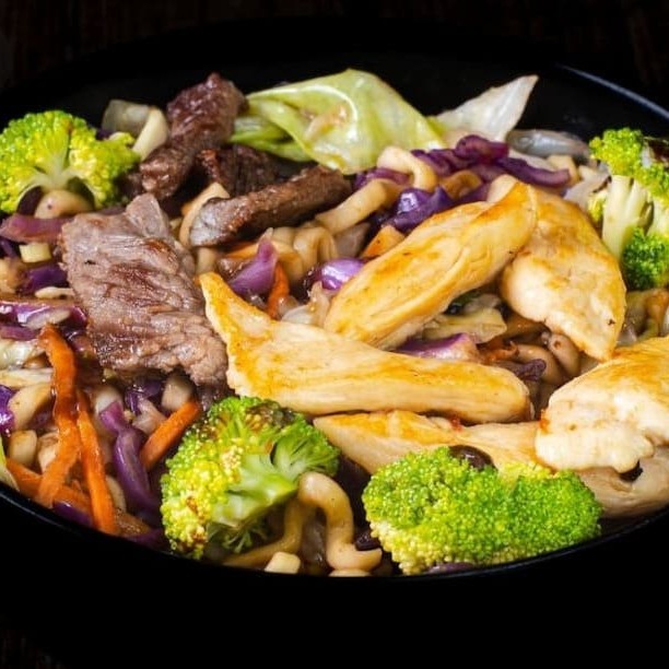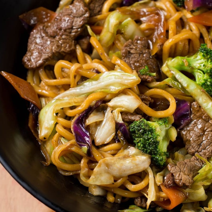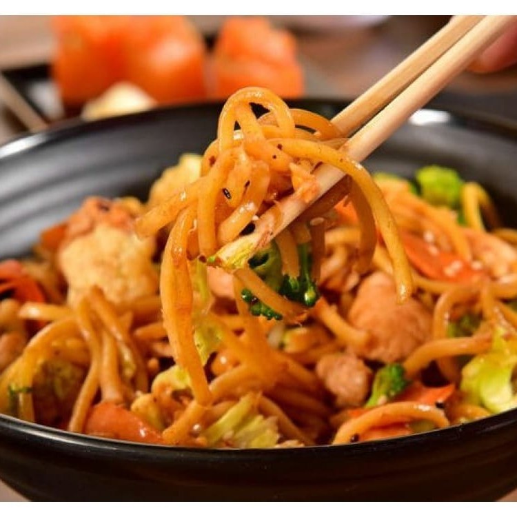 Massa para yakissoba, repolho roxo, repolho verde, cenoura, acelga, molho shoyu, tonkatso, hondashi, ajinomoto, óleo de gergelim, alho, brócolis, carne e frango. Serve 1 pessoa.