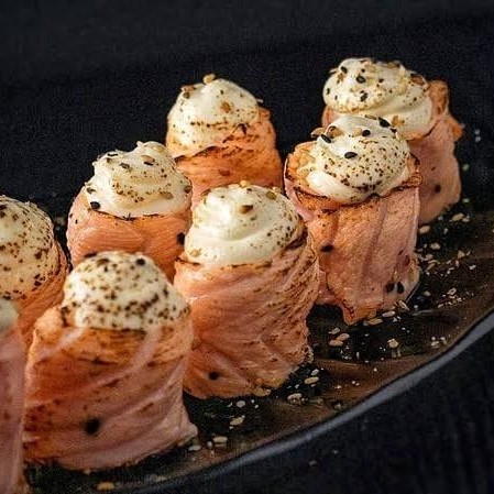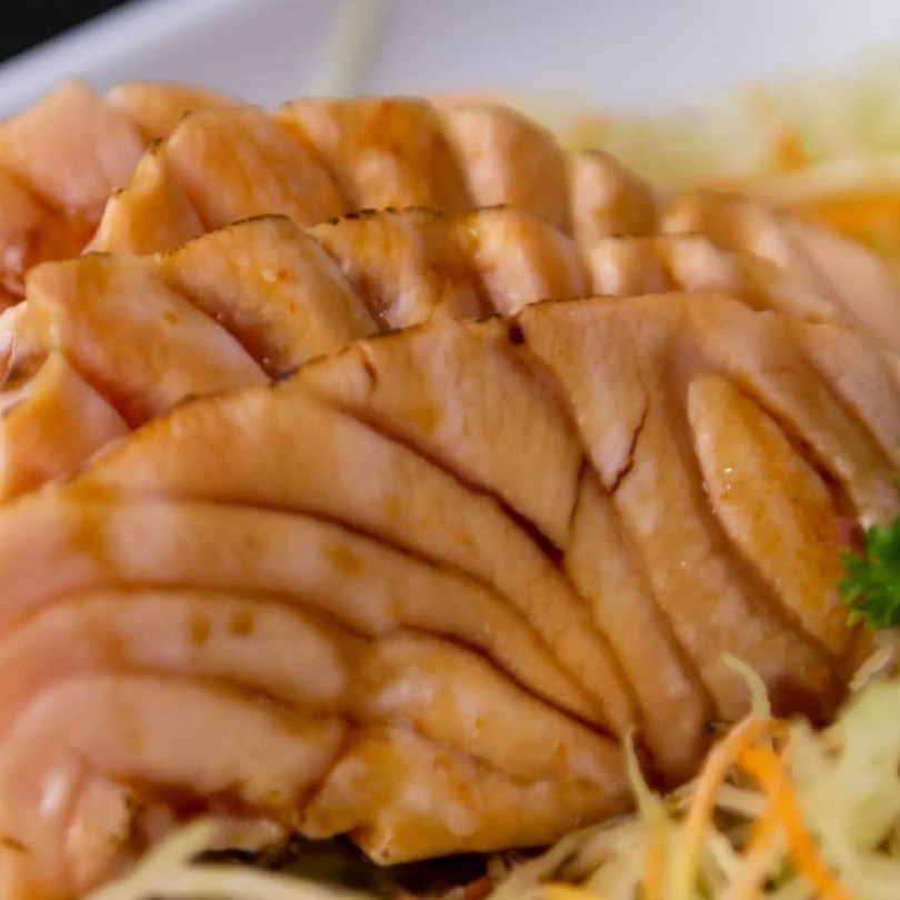 Descubra o prazer de degustar nosso Sashimi de Salmão Maçaricado. São quatro generosas peças de salmão, cuidadosamente selecionadas, cortadas em tiras suculentas e habilmente maçaricadas para realçar todo o seu sabor único e irresistível. A técnica do maçarico confere um toque especial ao prato, criando uma textura inigualável e um leve tostado que agrega ainda mais sabor. Prepare-se para uma experiência culinária requintada e memorável.