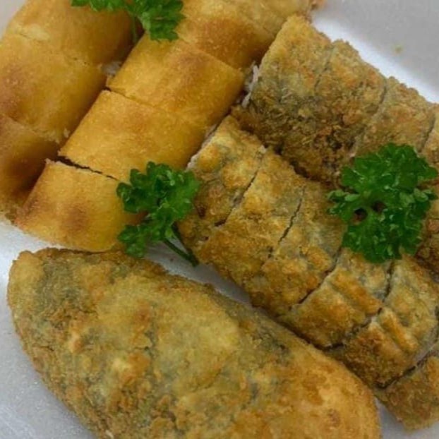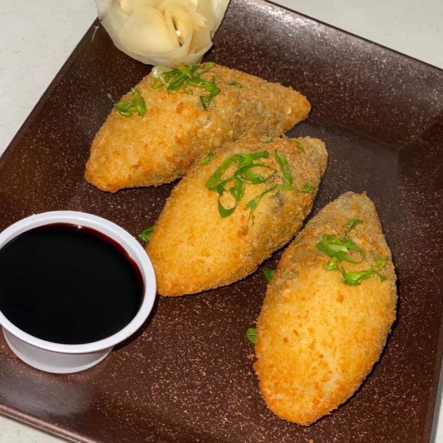 Recheado de salmão, arroz japonês e cream cheese e emapanado com farinha panko