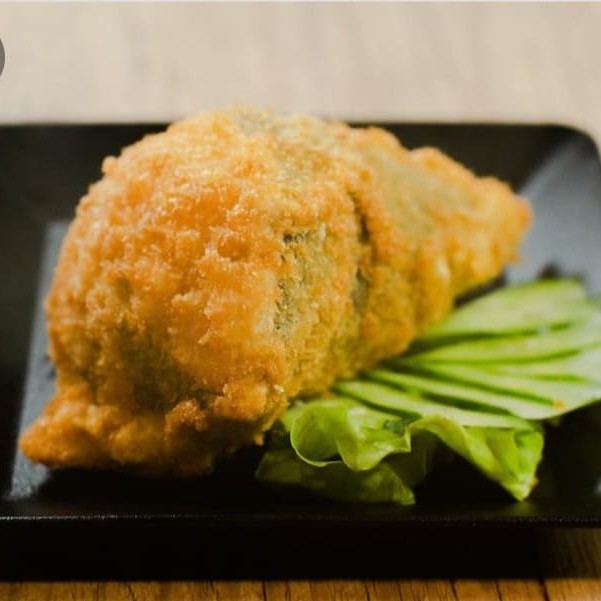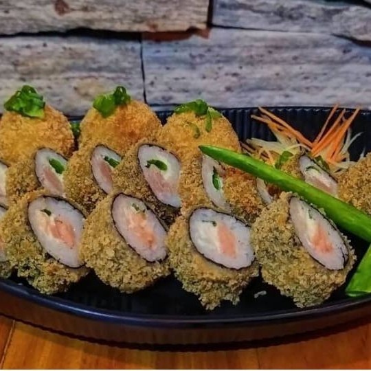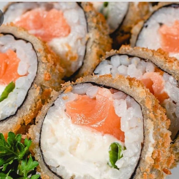 Alga, Arroz, Salmão, Creme Cheese, empanado e frito na Panko.