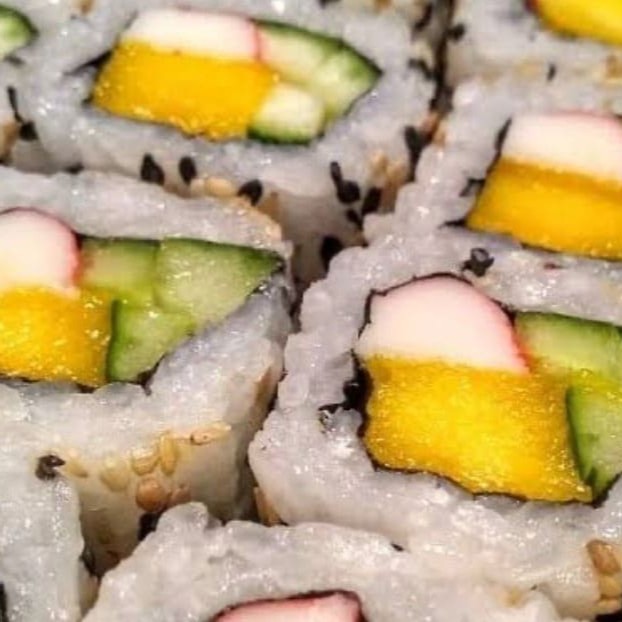 Alga, arroz por fora, gergelim, kani, manga e pepino.