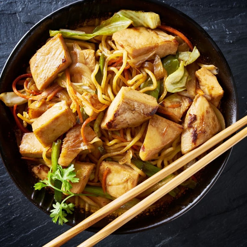 Yakissoba de Frango: Massa para yakissoba, repolho verde, repolho roxo, cenoura, acelga, brócolis, molho shoyu, tonkatsu, hondashi, ajinomoto, alho, óleo de gergelim e frango.