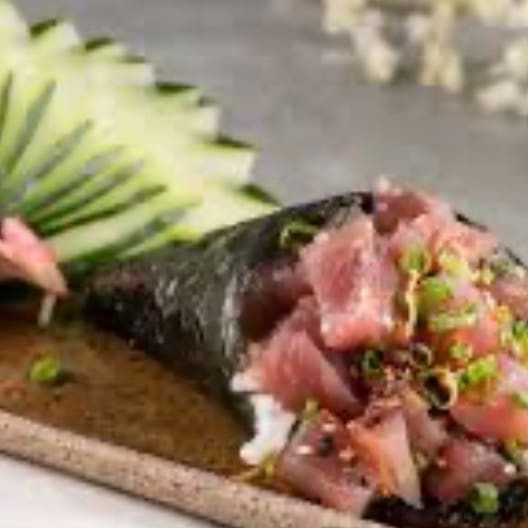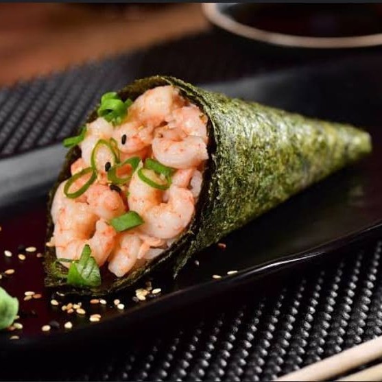 Nosso delicioso temaki com alga enrolado em forma de cone com arroz ,recheado de atum e cebolinha ..