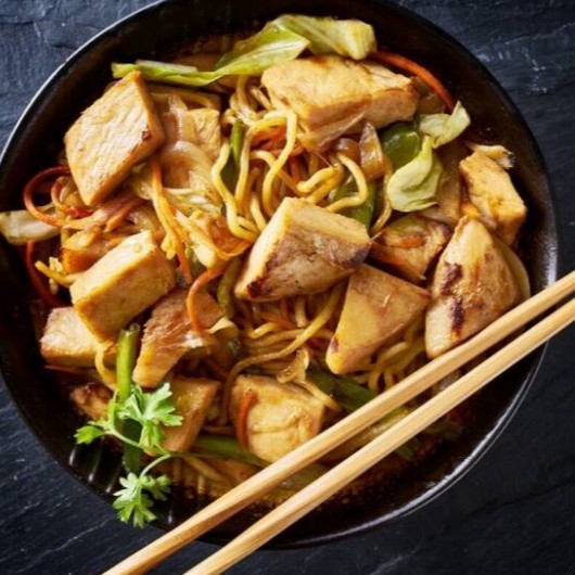 Massa para yakissoba, repolho roxo, repolho verde, cenoura, acelga, molho shoyu, tonkatso, hondashi, ajinomoto, óleo de gergelim, alho, brócolis e Salmão. Serve 1 pessoa.
