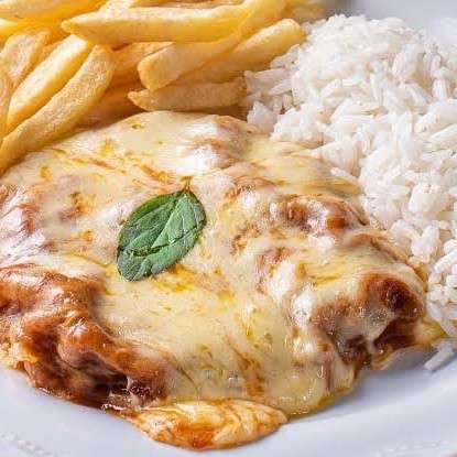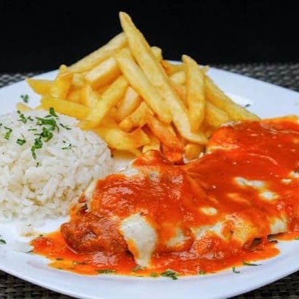 Para os apaixonados por carne, apresentamos nosso suculento 'Bife à Parmegiana com Fritas'. Uma generosa porção de bife empanado, coberto com um molho de tomate caseiro rico e vibrante, gratinado com queijo parmesão derretido, oferecendo um equilíbrio perfeito entre o sabor robusto da carne e a sutileza do queijo. Acompanhado de fritas crocantes, douradas ao ponto certo, e um arroz branco soltinho para completar. Uma refeição saborosa e bem servida, que promete saciar o paladar dos amantes de carne.