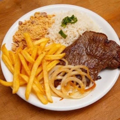 Descubra a delícia de nosso aclamado 'Bife coração da alcatra com fritas', um dos mais pedidos em nosso menu. Este prato primorosamente preparado é composto por um suculento bife contra filé, generosamente temperado e coberto com cebolas douradas e caramelizadas, que adicionam um toque de doçura irresistível. Acompanha uma porção generosa de batatas fritas crocantes, douradas na medida certa, e um arroz branco soltinho e perfumado. Para completar, temos nosso feijão caseiro, cozido lentamente até atingir a textura ideal, e uma farofa crocante e saborosa. Uma combinação perfeita de sabores que vai te deixar com água na boca. Experimente e encante-se!
