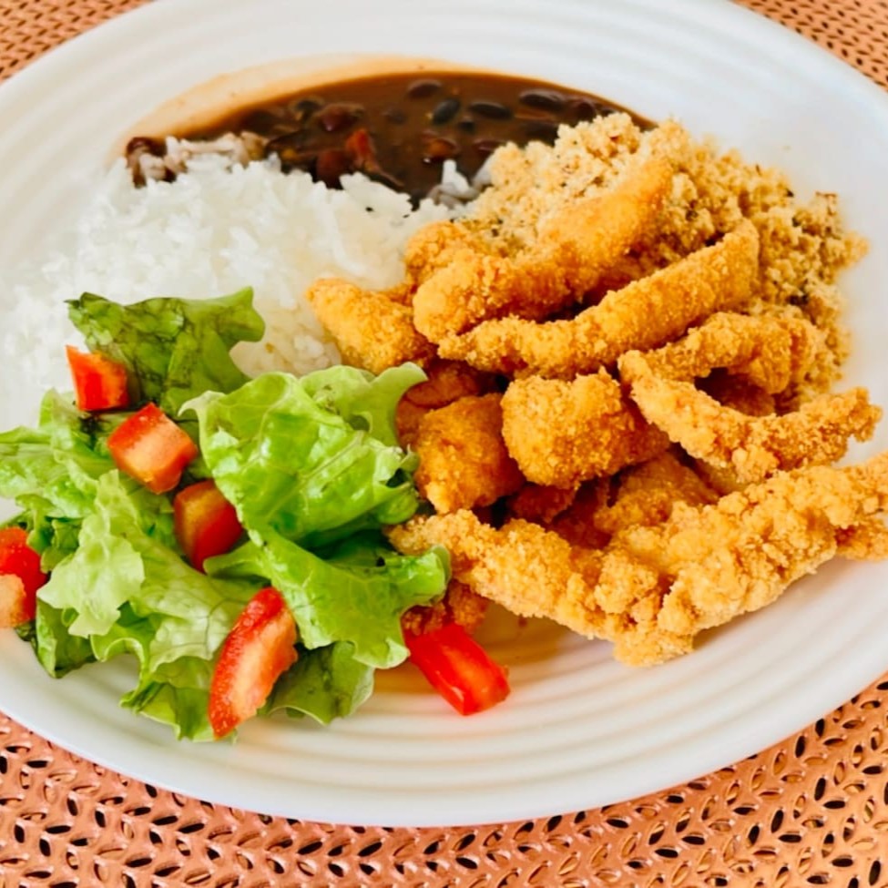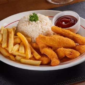 Tiras de file de peixe empanado + arroz branco + feijão + batata frita +salada