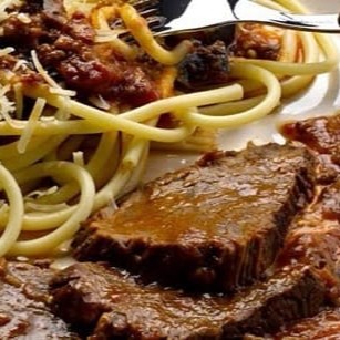2 pedaços de carne assada ao molho madeira + espaguete e porção de 50ml de queijo ralado