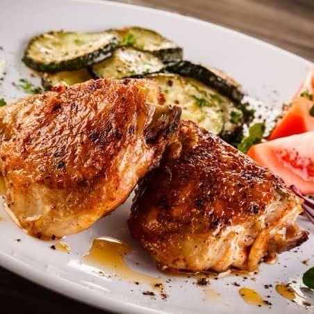 Deliciosa coxa e sobrecoxa de frango perfeitamente preparadas, acompanhadas de quiabo fresco, cozidos com maestria.