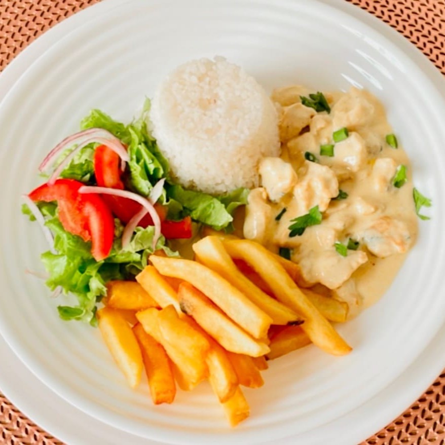 O 'Strogonoff de Frango G com Batata Frita' é um deleite para os amantes de frango. Acompanhado de um inconfundível arroz branco soltinho, temos o nosso sublime strogonoff de frango, preparado com um toque especial de cremosidade. A batata frita, crocante e dourada, é o complemento perfeito para este prato. E, para finalizar, uma refrescante salada de alface traz o equilíbrio necessário para essa combinação incrível. Venha experimentar essa maravilha da nossa cozinha!