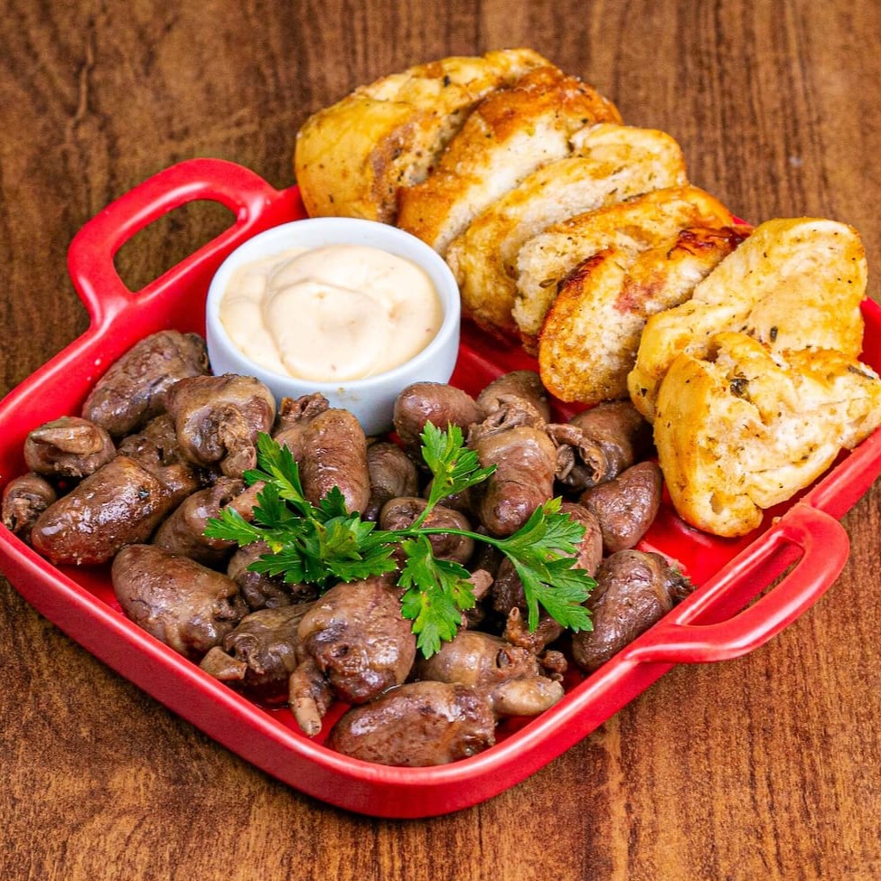 Porção De Corações Refogados Ao Alho E Shoyu. Servidos Com Torrada Temperada