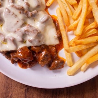 Iscas De Alcatra Salteada Em Molho Vermelho Feito Na Casa, Coberto Por Queijo Mussarela E Fritas Corte Fino.