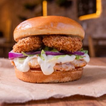 1º Burguer Artesanal 100% Camarão. Criamos Este Burguer Para Você Fã De Camarão. Servido Com Nosso Irrestivel Creme De Queijo, Alface, Tomate, Cebola Roxa E Camarões Empanados Em Panko Crocantes No Pão Brioche. Acompanha Maionese Da Casa.