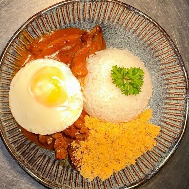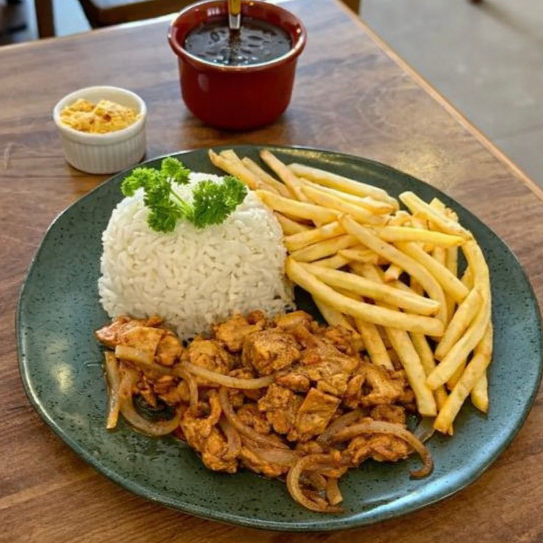 Picadinho de alcatra, servido com ovo estalado e molho secreto da chef, acompanha arroz branco, feijão e farofa de alho.