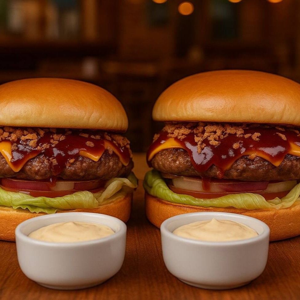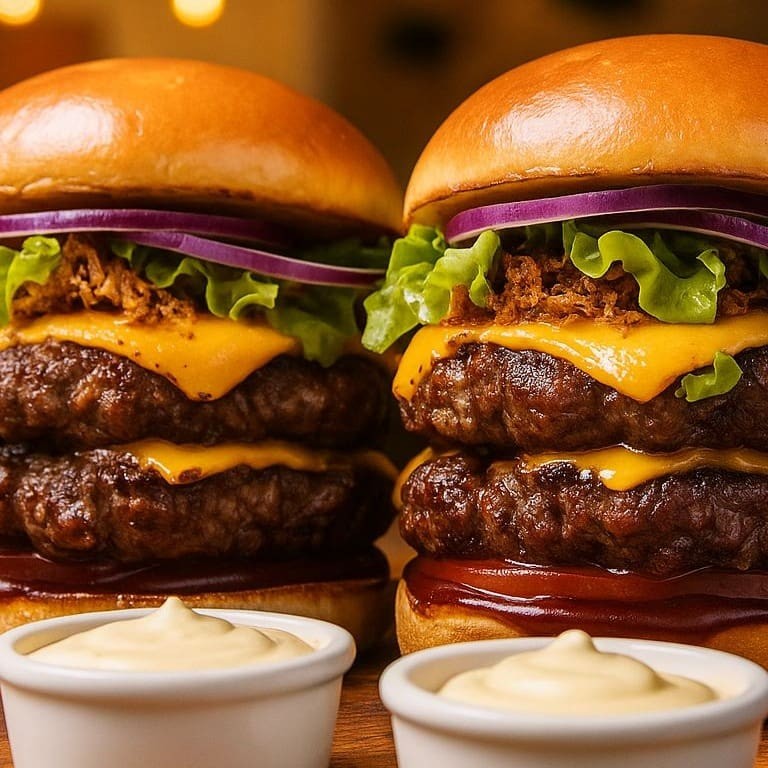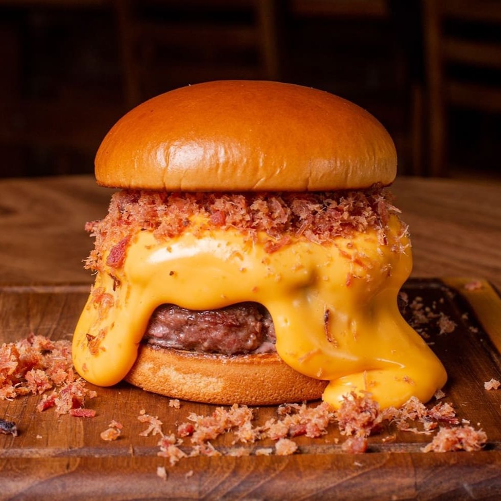 2 Burguer Artesanal De120g Feitos Na Brasa, Com Cheddar Fatiado, Farofa De Bacon E Creme Cheese No Pão Brioche.