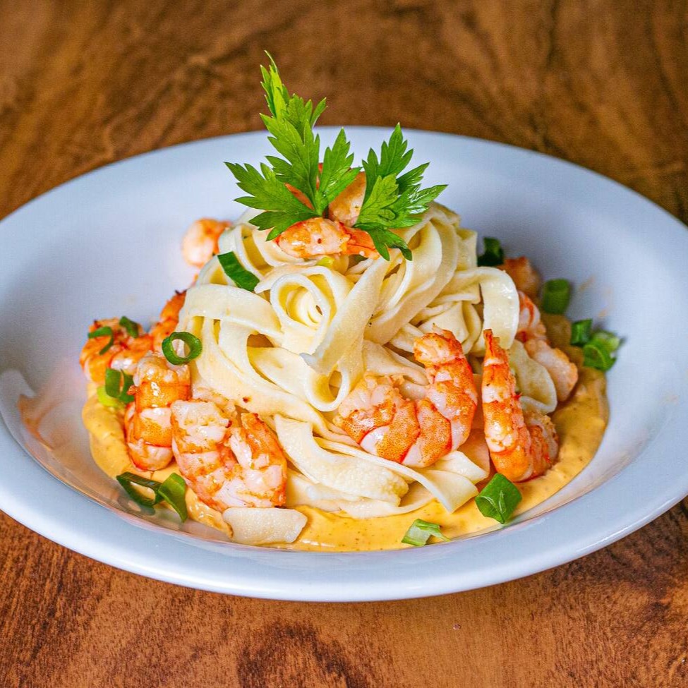 Corte Talharim, Servido Com Molho De Camarão A Base De Requeijão E Camarões Selados.