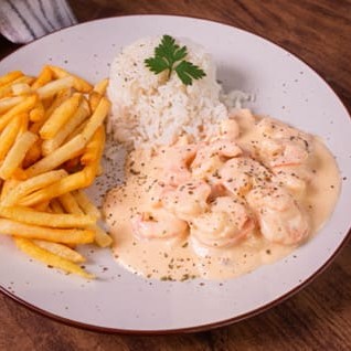 Prato Classico Da Casa Desde 2017. Nosso Irresistivel Molho De Camarão Ao Requeijão, Servido Com Arroz Branco E Fritas Corte Fino.