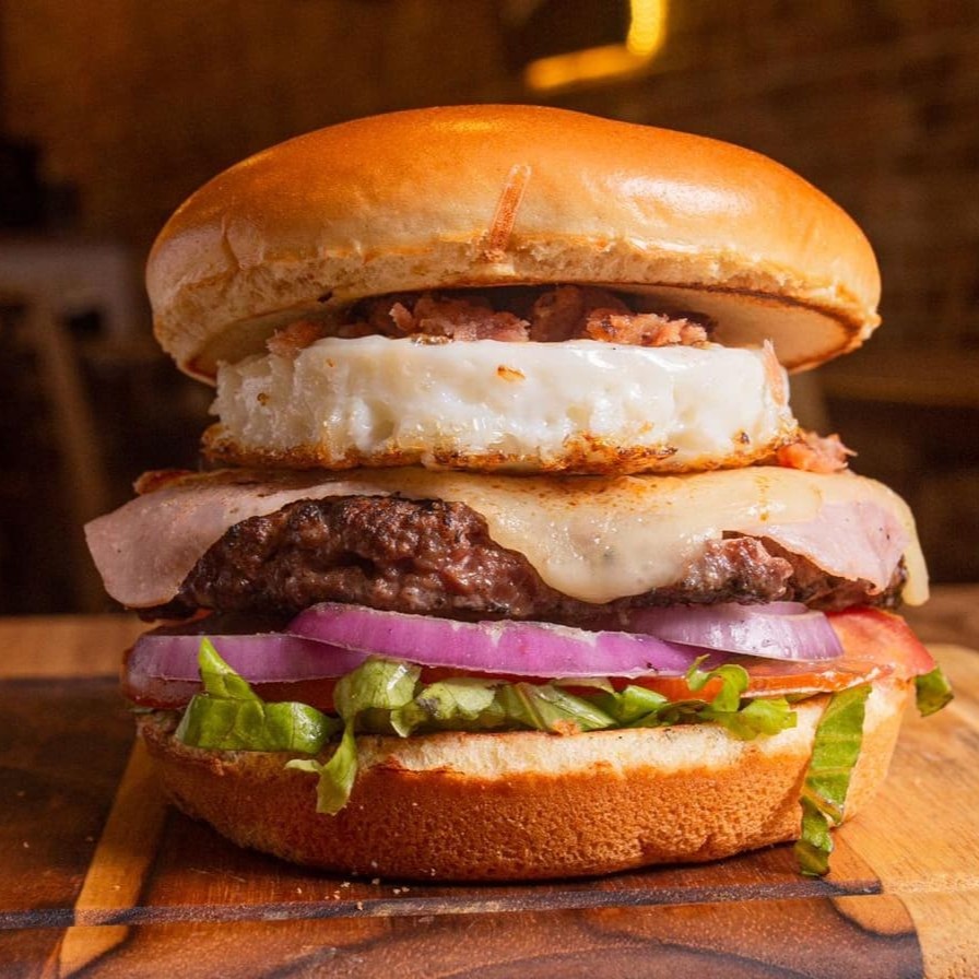 Burguer Artesanal De120g Feito Na Brasa, Com Cheddar Fatiado, Fatias De Bacon Crocante, Ovos, Alface, Tomate E Cebola Roxa No Pão Brioche. Acompanha Maionese Da Casa.