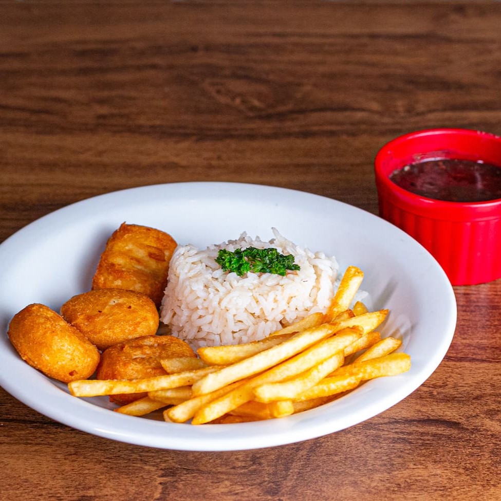 Para Os Descoladinhos, Um Jantar Especial. Arroz Branco, quatro nuggts, Fritas Corte Fino e Feijão. Acompanha Suco Kapo.