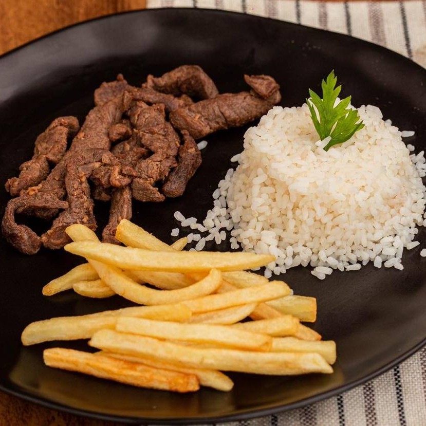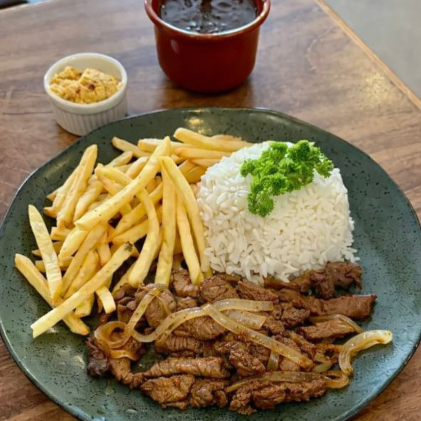 Acompanha: arroz branco, feijão, fritas e farofa