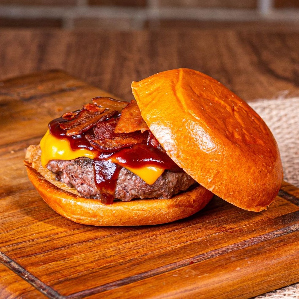 Burguer Artesanal De120g Feito Na Brasa, Coberto Por Fatias De Cheddar, Saboroso Molho De Sriracha, Com Fatias De Bacon Crocante, Alface Americano, Tomate E Cebola Roxa No Pão Brioche. Acompanha Maionese Da Casa.