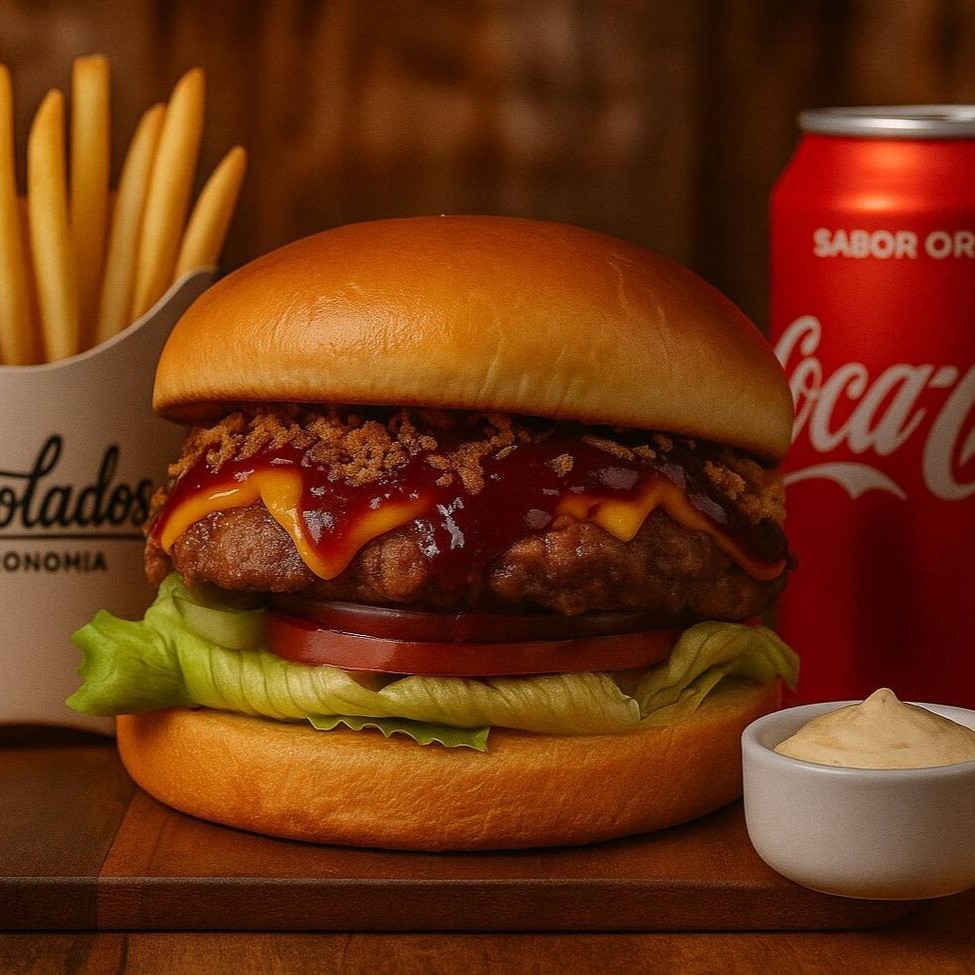 Campeão De Vendas !!! Burguer Artesanal De120g Feito Na Brasa, Com Cheddar Fatiado, Fatias De Bacon Crocante, Molho Barbecue, Alface Americano, Tomate E Cebola Roxa No Pão Brioche. Acompanha Maionese Da Casa. + fritas + refrigerante.
