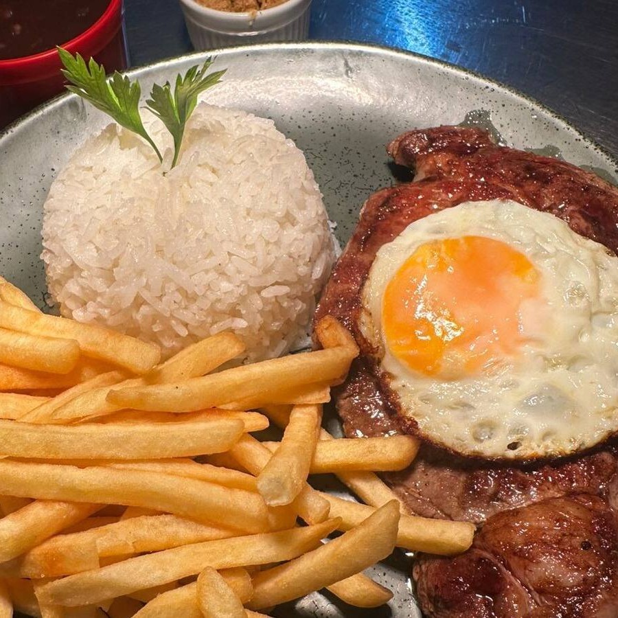 Filé na manteiga acompanhado de ovo estalado, arroz branco, fritas, feijão e farofa crocante.