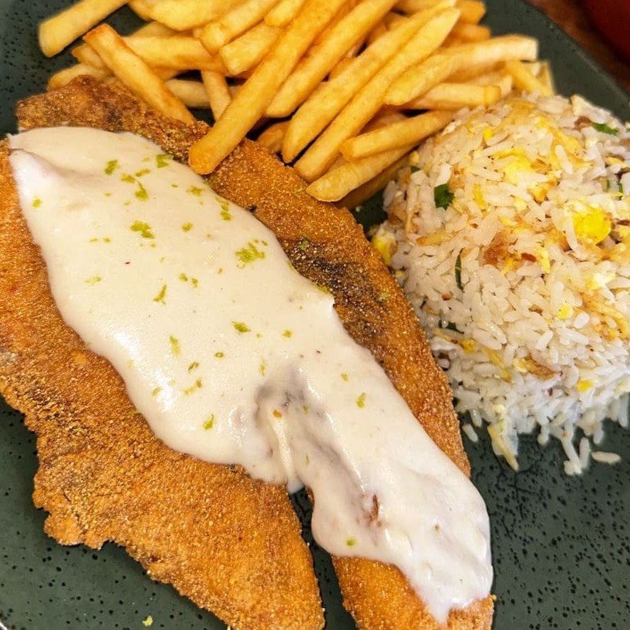 Filé de peixe frito ao molho de limão, servidos com arroz biro biro e fritas