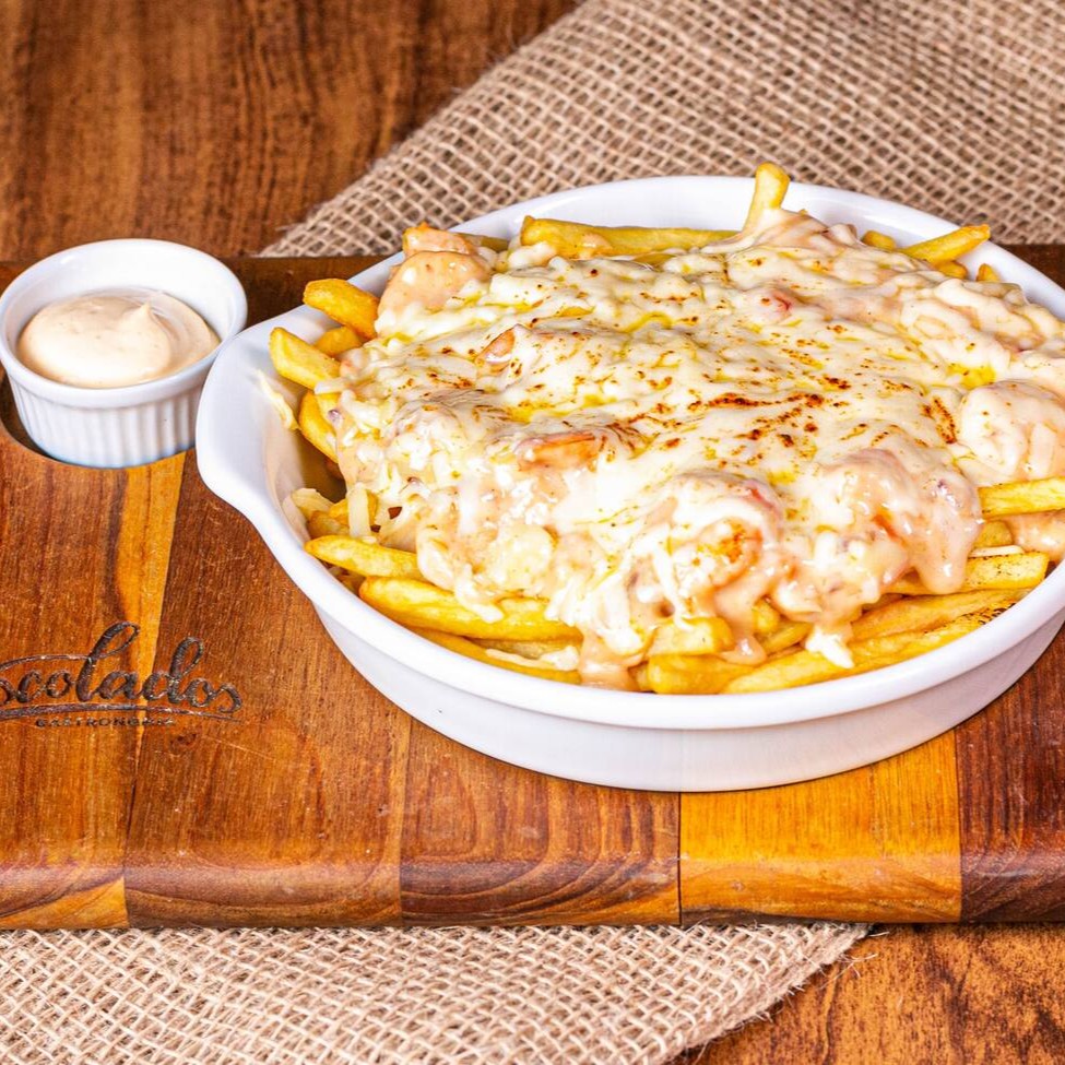 Porção De Fritas Corte Fino, Envolvida Por Nosso Cremoso Molho Bechamel Com Camaroes Refogados Ao Vinagrete E Queijo Gratinado. Impossivel Não Se Apaixonar Na Leveza E Sabor Dessa Porção.