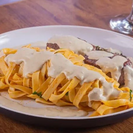 Corte Talharim Ao Pomodoro Servido Com Contra Filé Ao Alho E Espetacular E Saboroso Creme De Queijos Da Casa