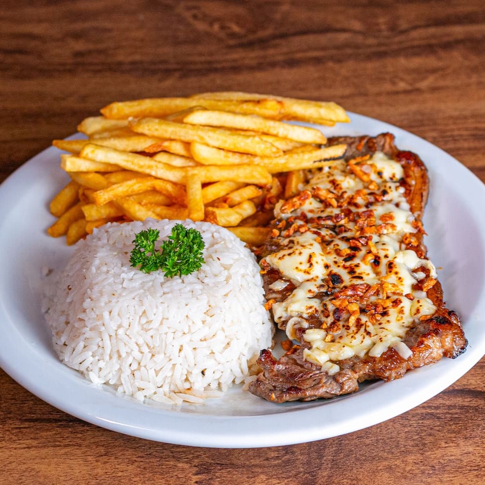 Suculento Contra Filé Feito Na Manteiga Com Especiarias, Finalizado Com Queijo Gratinado E Servido Com Arroz E Fritas Corte Fino.