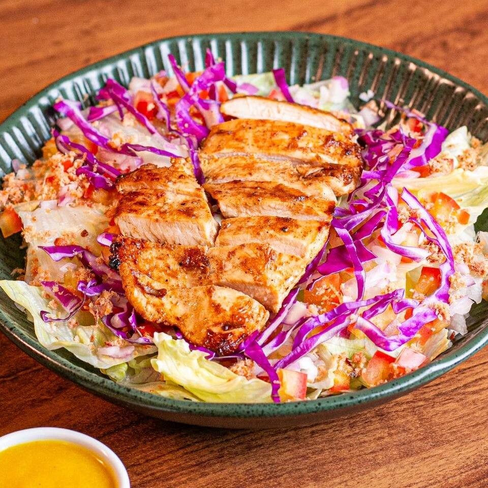 Mix de alface americana, tomate, cebola roxa, repolho roxo, cenoura ralada, tiras de frango, farofa de bacon e molho a sua escolha. (mostarda e mel, sriracha ou maionese da casa)