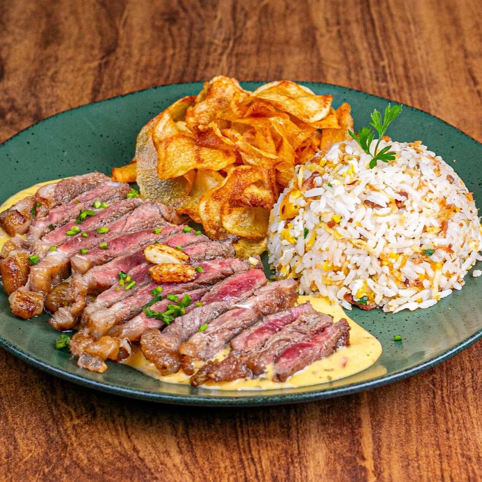 Suculento Contra Filé Ao Seu Ponto De Escolha, Servido Com Molho Béarnaise, Chips De Batata Inglesa E Arroz Biro Biro