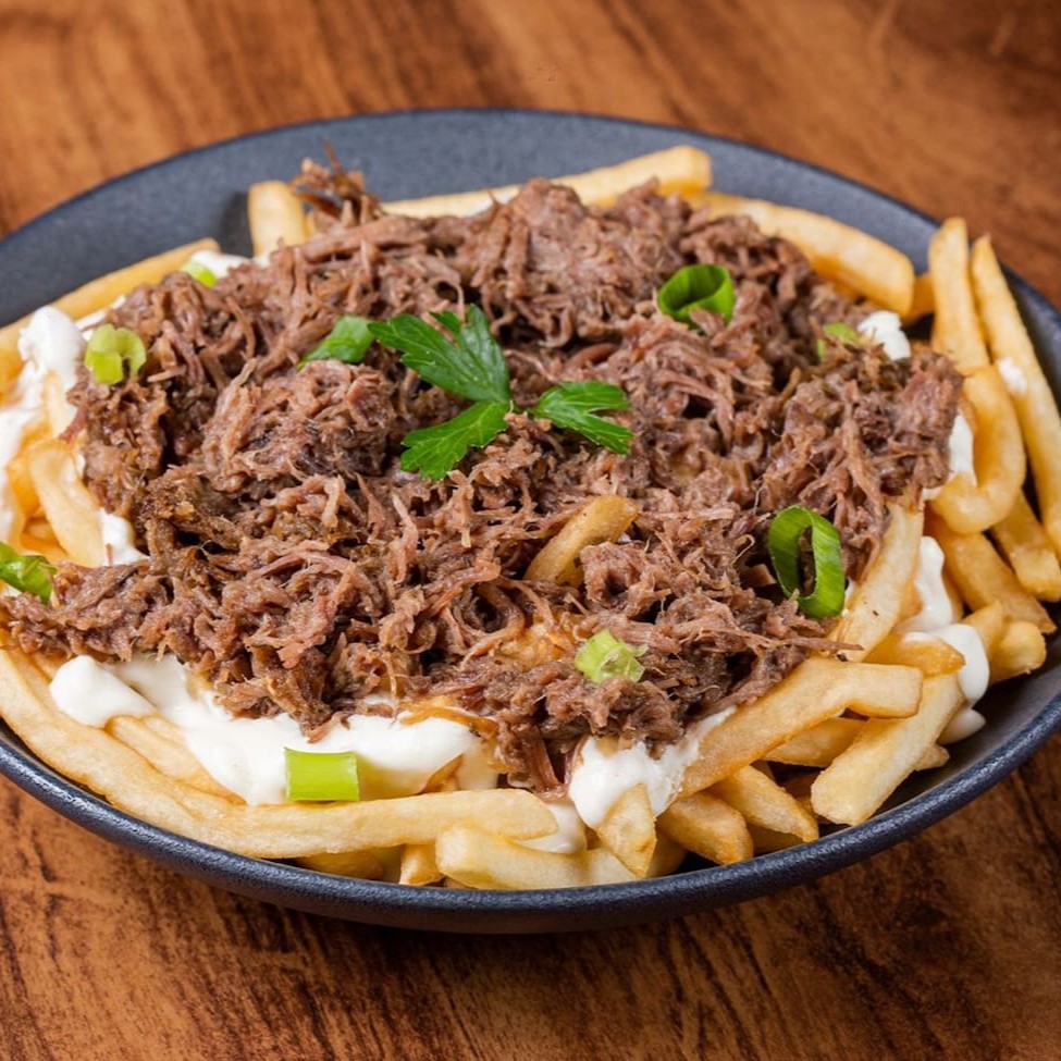 Porção De Fritas Corte Fino, Envolvida Por Nosso Creme De Queijo Artesanal E Nossa Suculenta E Famosa Costela Bovina Desfiada, Finalizado Com Cebolete Verde.