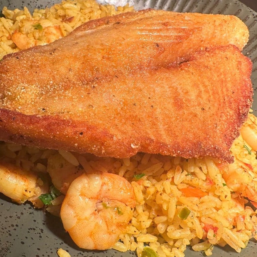 Delicioso arroz de camarão, servidos com filé de peixe frito.