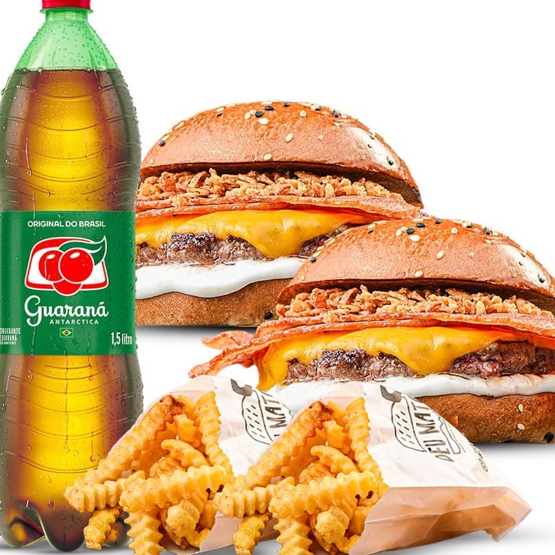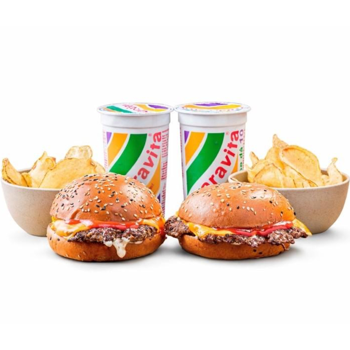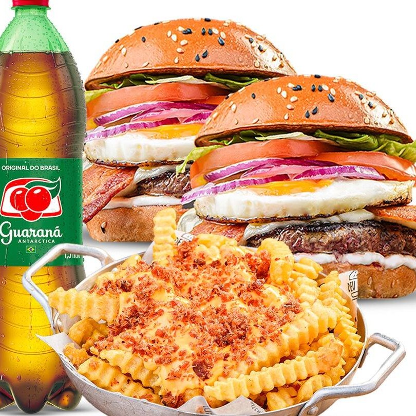 O nosso combinho leva 2 Smash ( Pão, carne, queijo cheddar, catchup e maionese), 2 batatas chips e 2 guaravitas geladinhos