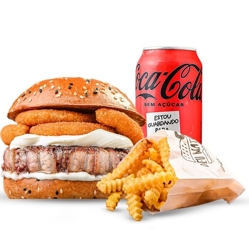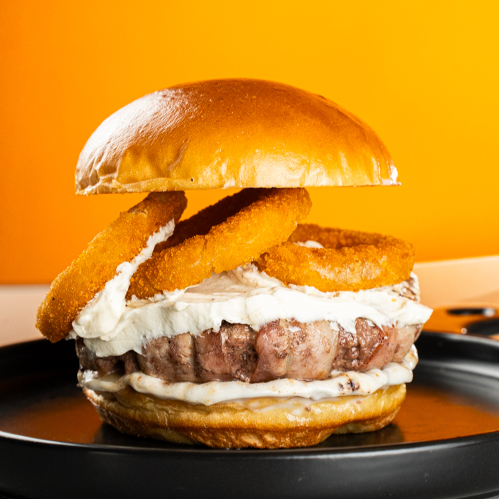 Pão brioche, blend bovino com 150g envolto por fatias de bacon, cream cheese, anéis se cebola e maionese da casa