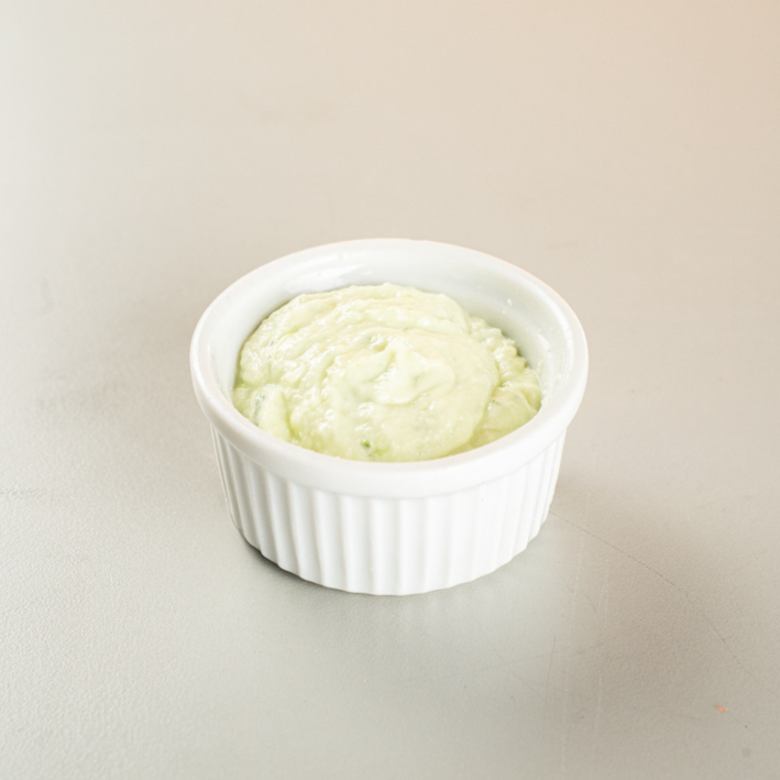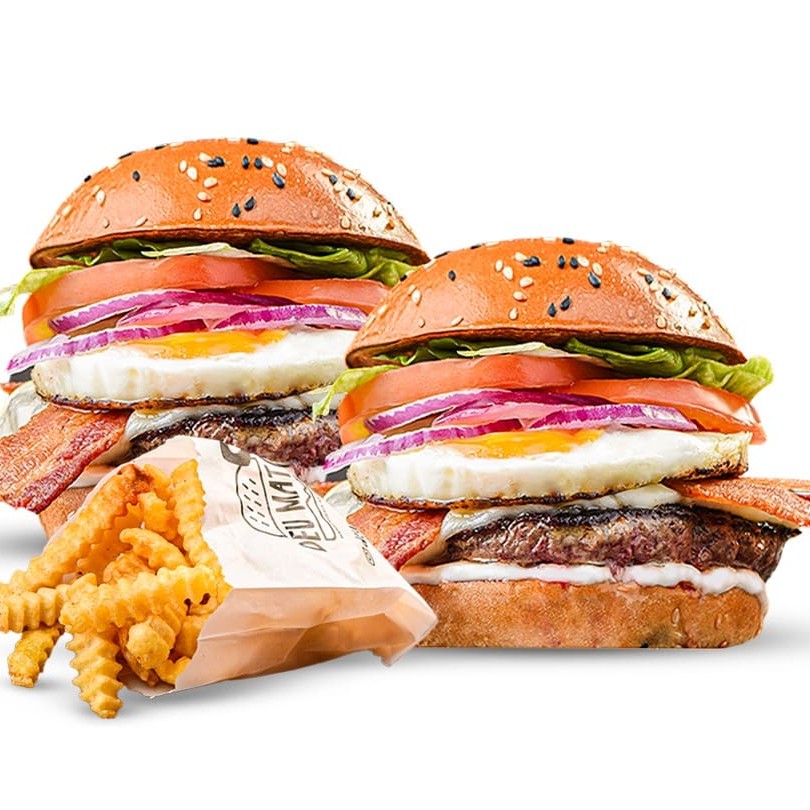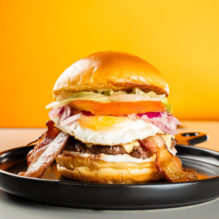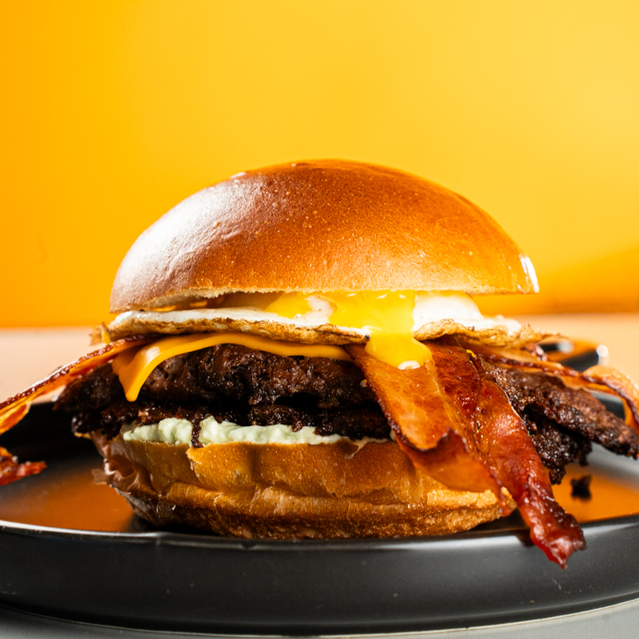 Pão brioche, 2 blend de 80g prensados na chapa, queijo cheddar, fatias de bacon, ovo e maionese verde