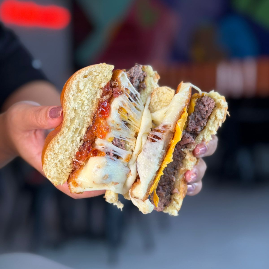 Pão Brioche, Blend 150g, queijo cheddar, muçarela empanada, geleia de bacon e maionese da casa