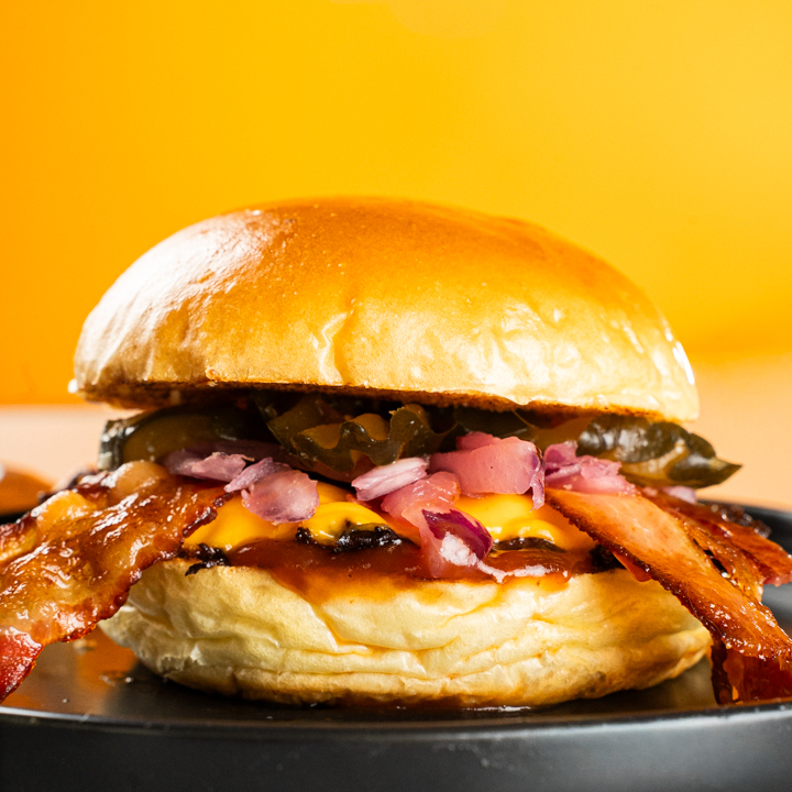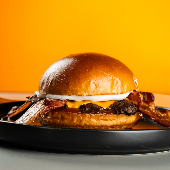 Pão brioche, blend de 80g prensado na chapa, queijo cheddar, fatias de bacon, cebola roxa, picles e catchup.