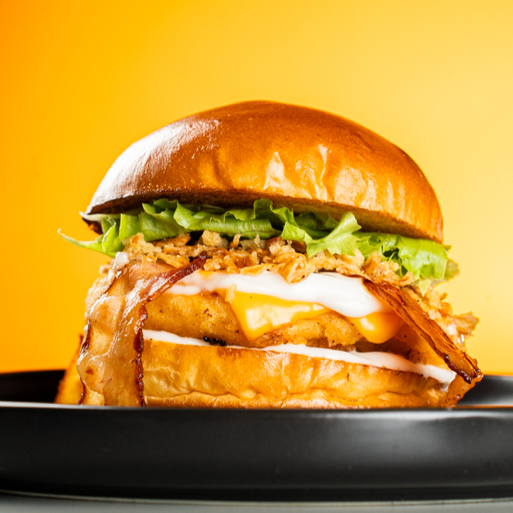 Pão de batata com gergelim, filé de sobrecoxa empanado, quejo cheddar, fatias de bacon, cebola caramelizada e barbecue