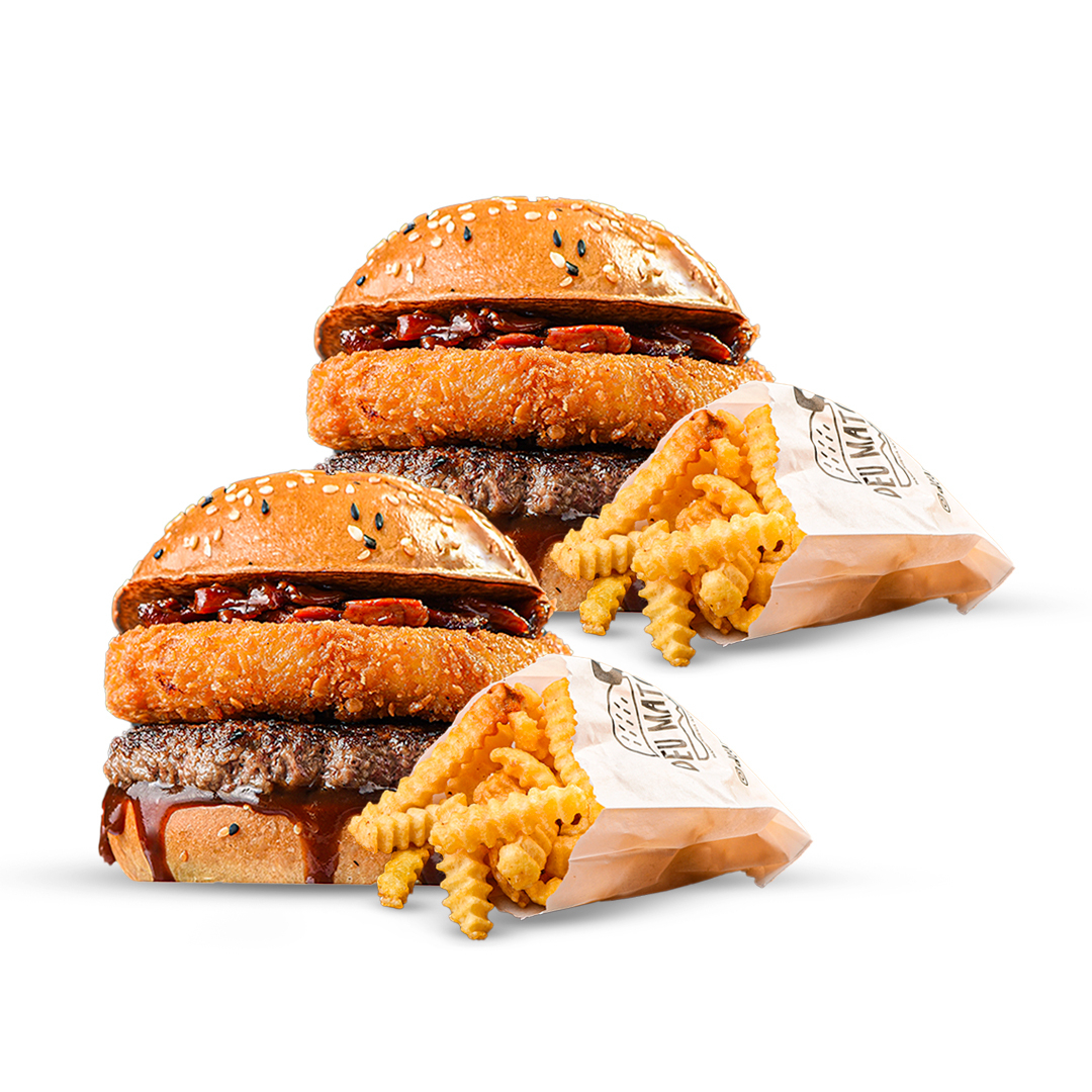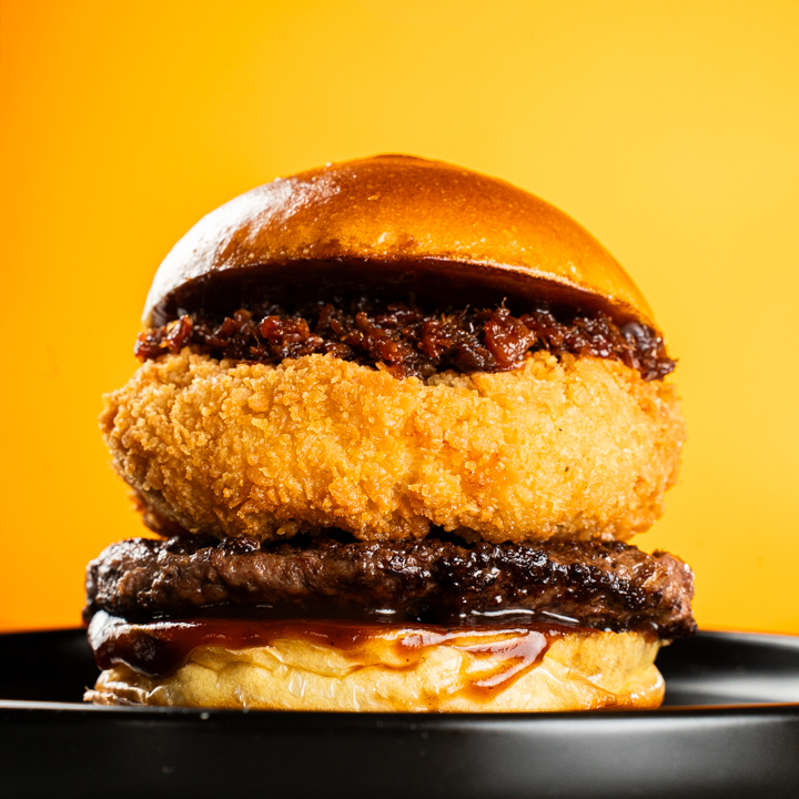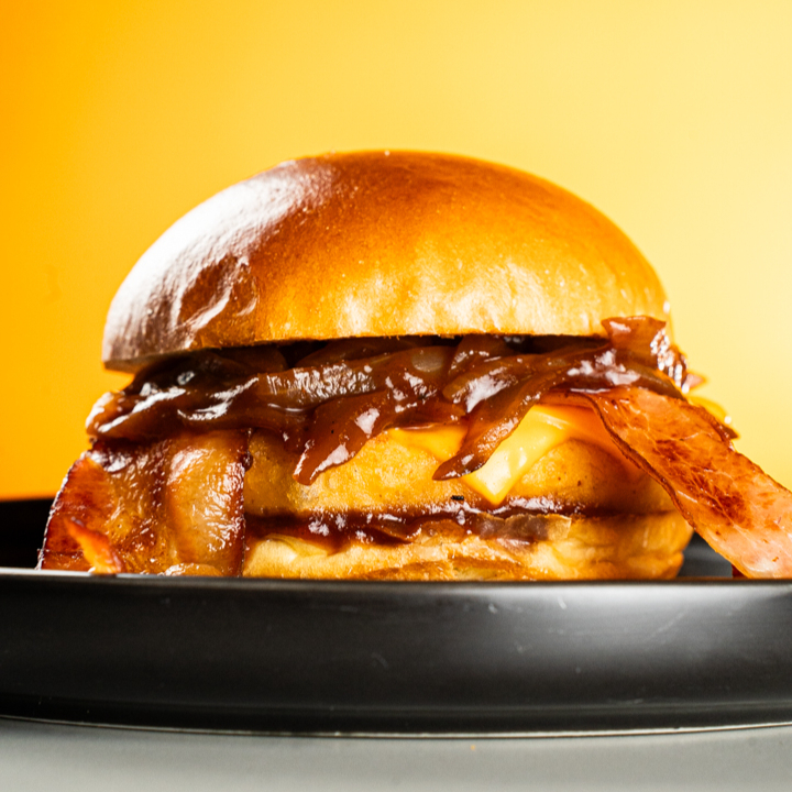 Pão brioche, barbecue, blend bovina de 150g, geleia de bacon artesanal e Catupiry Original empanado
