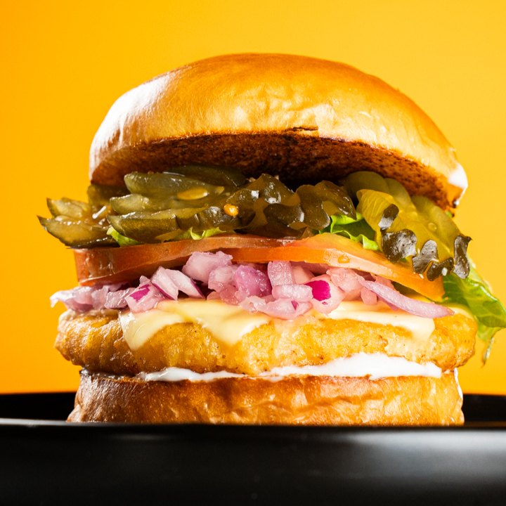 Pão brioche, nosso file de sobrecoxa empanado, fatias de cheddar, maionese da casa, alface, tomate, cebola roxa e picles.
