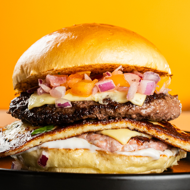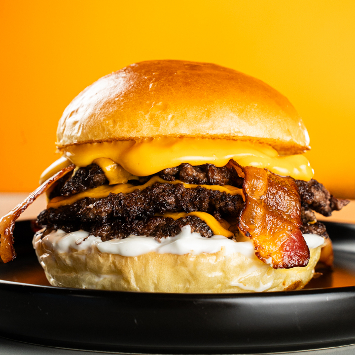 Pão Brioche, 3 blend de smash de 80g prensados na chapa, fatias de cheddar, fatias de queijo e maionese da casa