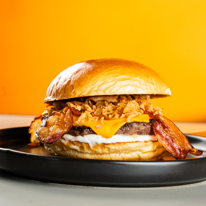 Pão brioche, blend de 150gr, queijo cheddar, fatias de bacon, cebola crispy e maionese da casa