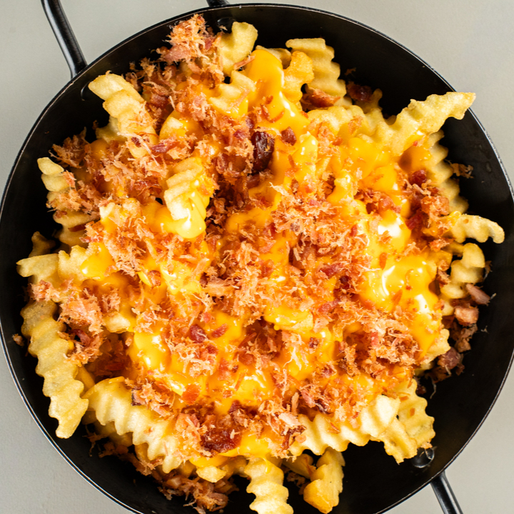 Porção de batata crinkle, creme cheddar artesanal e farofinha de bacon.