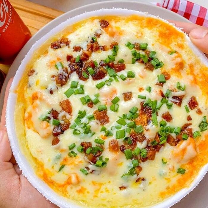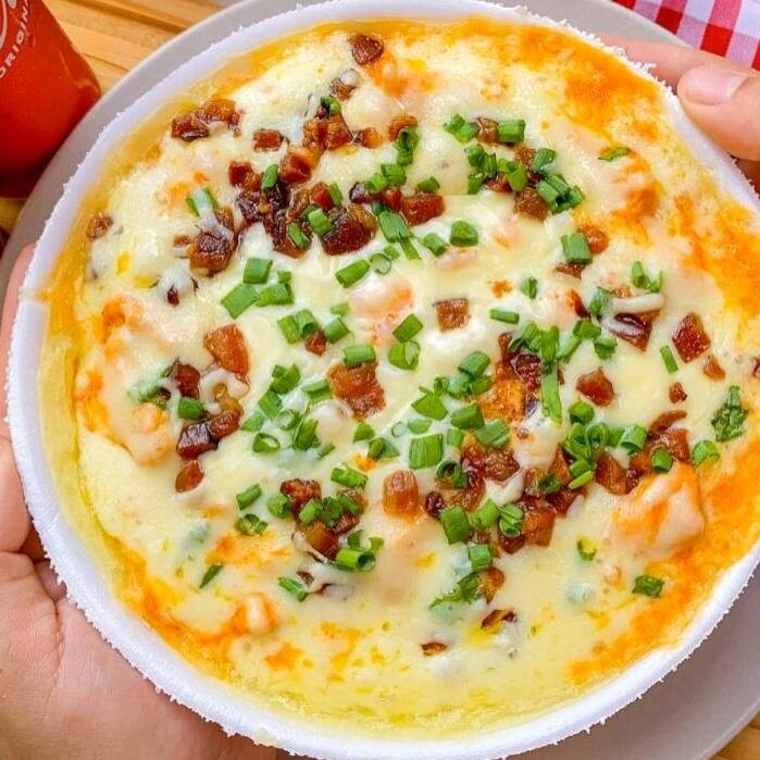Batata Cozida, Recheada com camarão ao molho branco.. Fechamento: Mussarela Derretida, Requeijão, Bacon, Cebolinha