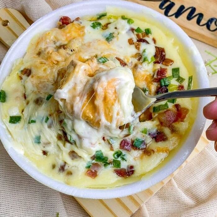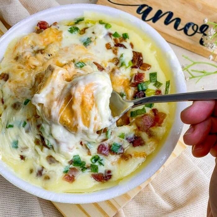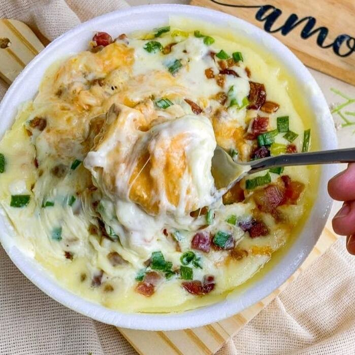 Batata Cozida, Recheada com pedaços de frango ao Molho Branco. Fechamento: Mussarela Derretida, Requeijão, Bacon, Cebolinha
