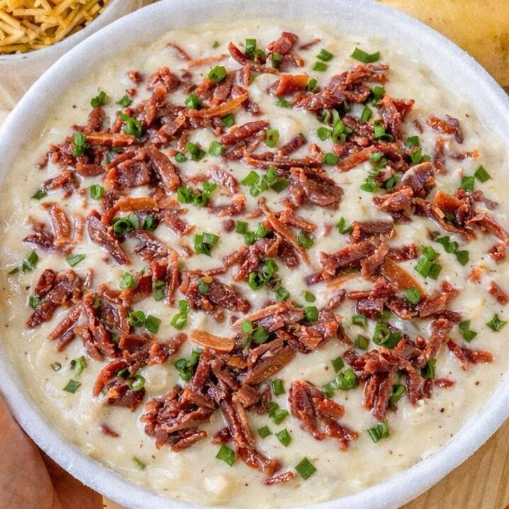 Batata Cozida, Recheada Com Carne Seca Desfiada Ao Molho Branco. Fechamento: Mussarela Derretida, Requeijão, Bacon, Cebolinha